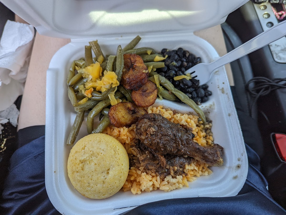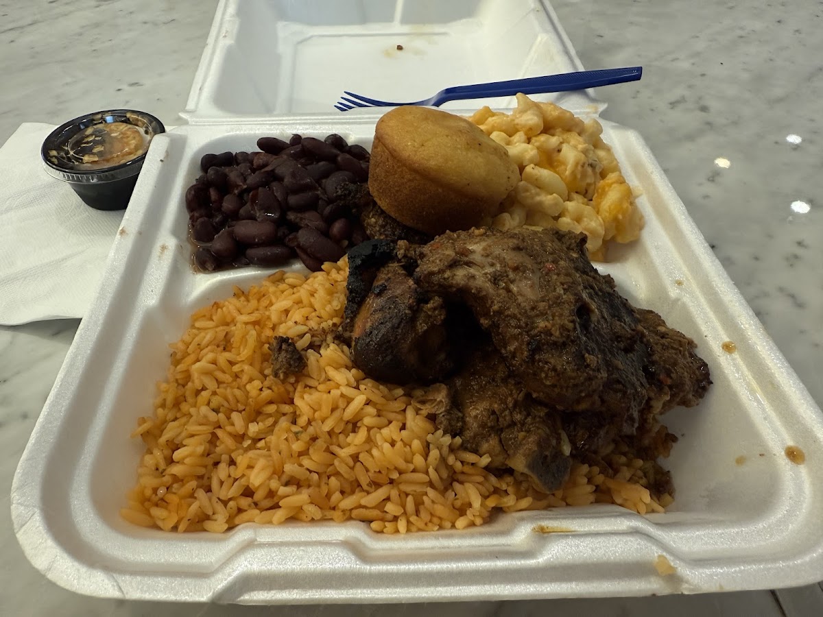 I wanted lunch, but not the usual cookie cutter food. I am visually impaired she gladly explained the options. This is it! So good. I had jerk chicken , rice beans and had to try the Mac and cheese. Also a lime drink that was the right amount of sweet Spicy pinto beans were just perfect. I highly recommend ! Definitely will be back